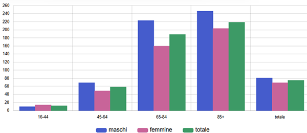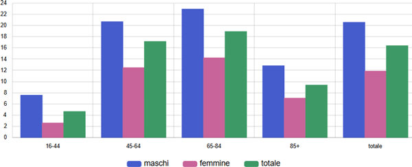 Tra gli scompensati ultra16enni, il tasso di utilizzo di questi farmaci è più alto nelle fasce d’età tra i 45 e gli 84 anni, è più basso tra chi ha meno di 45 anni e soprattutto più di 84 anni ed è sempre notevolmente più alto tra gli uomini che tra le donne (figura 7).
