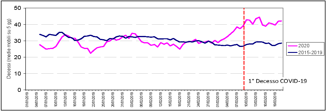 L’andamento giornaliero dei decessi (calcolati su medie mobili di 5 giorni) dal 1 gennaio al 21 marzo (Figura 5), mostra come le due linee iniziano ad allontanarsi a fine febbraio, prima della data ufficiale del primo decesso per COVID-19 avvenuto il 9 marzo 2020 (linea rossa).