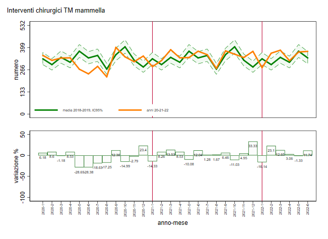 Gli interventi chirurgici del tumore alla mammella, a parte una significativa diminuzione tra maggio e agosto 2020, sono tornati stabili ai livelli pre-pandemici (figura 1h).
