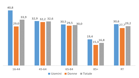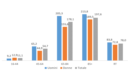 In Toscana all’inizio del 2019, il 78‰ degli assistiti risulta affetto da diabete. Il diabete risulta più frequente tra gli uomini che nelle donne (83,8‰ vs 72,8‰) in tutte le fasce di età, tranne che in quella più giovane, nella quale si osserva una prevalenza leggermente maggiore nelle donne (Figura 1).