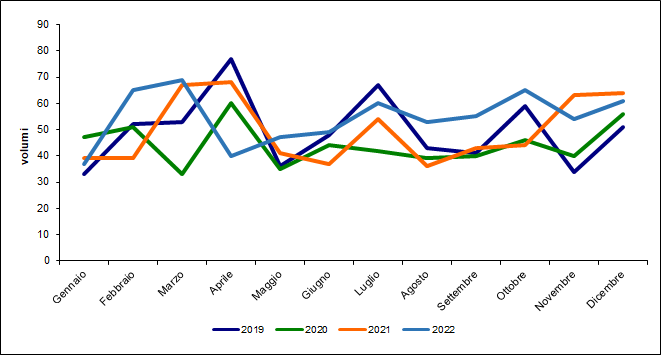 Figura 3. Volumi mensili di interventi per tumore del retto, anni 2019, 2020, 2021 e 2022