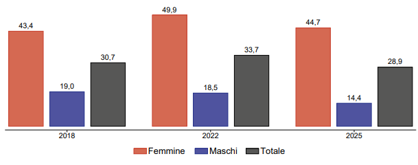 Nel 2025 quasi un giovane su tre presenta un livello elevato di distress psicologico, con un divario di genere molto marcato: il fenomeno riguarda oltre il 44% delle ragazze contro il 16% dei ragazzi. Nonostante un lieve miglioramento rispetto al picco del 2022, i livelli restano elevati, soprattutto tra le adolescenti più grandi.