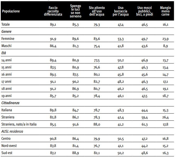Le azioni adottate per ridurre il proprio impatto mostrano un quadro misto. Alcuni comportamenti di facile attuazione sono molto diffusi: l’89,1% effettua la raccolta differenziata, l’85,3% spegne le luci inutili e il 79,3% presta attenzione all’uso dell’acqua. Meno diffuse le azioni più impegnative: solo il 46,5% sceglie la mobilità sostenibile, il 47,4% usa la borraccia e appena il 16,1% riduce il consumo di carne. Le ragazze adottano più frequentemente stili di vita sostenibili, mentre tra gli stranieri emerge una maggiore propensione alla mobilità sostenibile e alla riduzione del consumo energetico. Le differenze per età sono contenute, con un lieve aumento dei comportamenti più virtuosi tra i ragazzi più grandi.