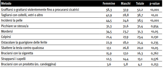 L’autolesionismo, pur in calo rispetto al 2022, interessa ancora il 12,7% degli adolescenti e si manifesta spesso in età molto precoce. Rimane forte la componente di genere: 18,8% delle ragazze contro 7,2% dei ragazzi, con un’età di esordio in oltre due terzi dei casi entro i 14 anni. Preoccupante anche l’intensità dei comportamenti: un quinto dei maschi che ha praticato autolesionismo riferisce più di 50 episodi nella vita. Le modalità più comuni sono graffiarsi fino a procurarsi cicatrici (52,2%), tagliarsi o incidersi, con prevalenze più elevate tra le ragazze; i maschi ricorrono più frequentemente a colpire oggetti o sbattere la testa. Circa un decimo del campione ha richiesto cure mediche in seguito ad atti autolesivi.