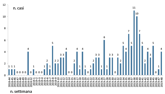 Casi NDM in Toscana per settimana, novembre 2018-2 dicembre 2019